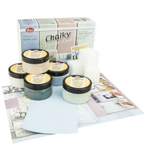 inhoud: 5 potjes Chalky Vintage look in spaciale 90ml proefverpakking, 3 sponsjes, 1 velletje fijn schuurpapier en een brochure met gebruiksaanwijzing.