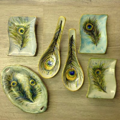 Bij de pauwen stempel is het hart verwijderd met een wattenstaafje met alcohol en zijn de lijntjes opnieuw geschilderd, omdat de stempel te dicht was. Aardewerk is niet altijd 100% horizontaal en dan gaat stempelen soms makkelijker zonder stempelblok. Droog de afdruk. Voor de pauwen veren is een liner penseel van de Artist Brush Set heel geschikt. Gebruik altijd weinig verf, om een donkerder resultaat te verkrijgen kan je beter steeds laagje over laagje schilderen .